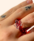 A unique addition to your jewelry collection! This chunky red borosilicate glass ring features a dainty clear flower charm.