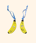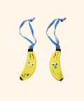 A silly little hand painted ceramic banana ornament featuring a happy side and a miffed side, celebrating all of life's ups and downs.