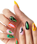 A cool and unique set of reusable press-on nails featuring playful designs!