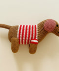This adorable sized baby rattle is perfect for grasping, shaking and loving, our little puppy is wearing its stripey red sweater and made from the same organic cotton you adore.