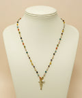 These little gold vintage Koi fish charms are EVERYTHING! Symbols of good luck, the Koi charm is topped off with two pearl ‘treasures’ to make it extra special. Paired with a 21” rosary style chain accented with multicolored spinel stones, what’s not to love!
