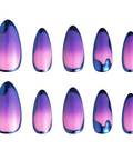 A cool and unique set of reusable press-on nails featuring playful designs! A mesmerizing blend of metallic purples and blues, designed for bold statement-makers who shine.