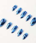 A cool and unique set of reusable press-on nails featuring playful designs! Sapphire Savage with a liquid chrome finish is crafted for fearless trendsetters who own the spotlight.